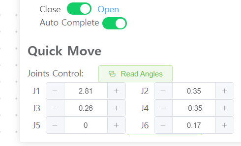 다행히! myCobot은 수동 조정 값 읽어오기(Read Angles)를 지원하고 있어서, cobot을 우리가 원하는 자세로 잡아두고, 해당 각도 값들을 불러올 수 있었다.