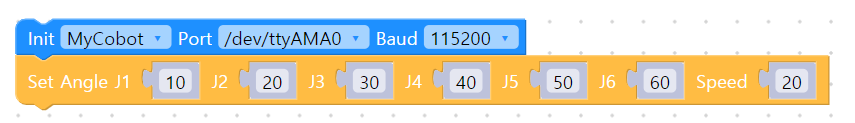 MyCobot 클래스의 인스턴스를 만들어 사용하며, Set Angle J1의 경우, send_angles 메서드를 통해 각 관절에 대한 각도를 list 하나로 받고, speed를 따로 받고 있는 것을 볼 수 있다.🐱